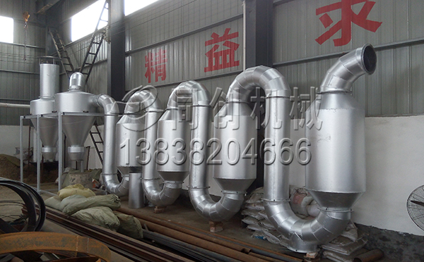 氣流式烘干機(jī)是指把粉粒體狀濕鋸末,采用螺旋輸送機(jī)將其連續(xù)加入干燥管內(nèi)。在高速熱氣流的輸送和分散中,使?jié)裎锪系闹械乃终舭l(fā),得到粉狀或粒狀干燥產(chǎn)品的過程。主要由空氣加熱器、加料器、氣流干燥管、旋風(fēng)分離器、風(fēng)機(jī)等組成。